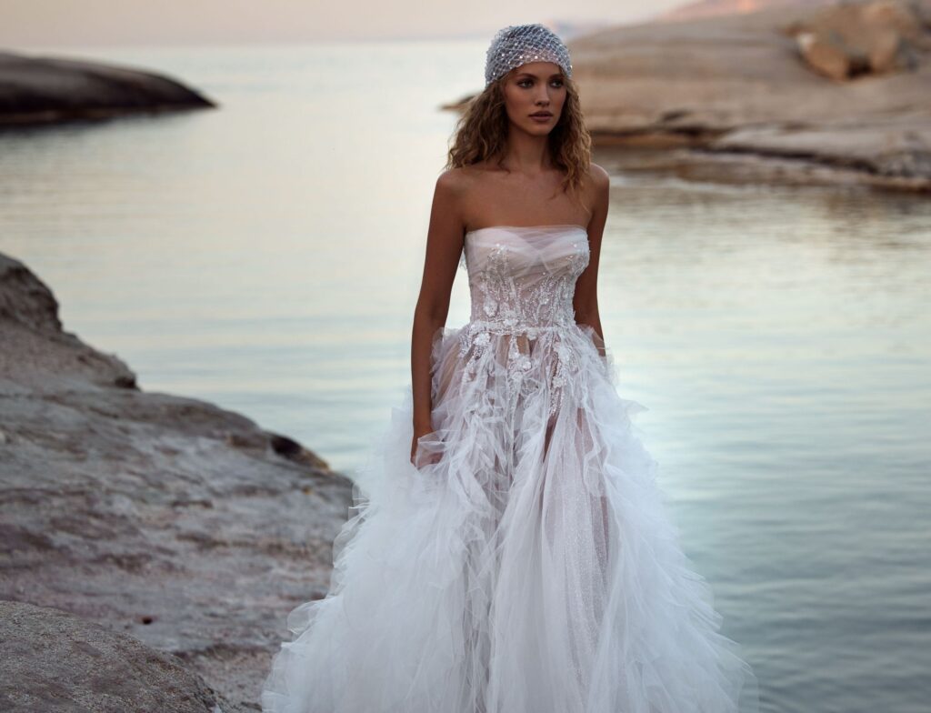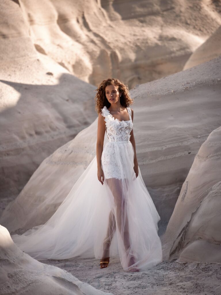 Sheer fabrics, such as gauzy tulle and lace, are becoming increasingly popular, extending their presence beyond traditional veils. Designers are embracing the trend by using unlined lace and ethereal tulle to craft romantic, semi-transparent elements that introduce a subtly sensual, boudoir-inspired feel to bridal fashion.