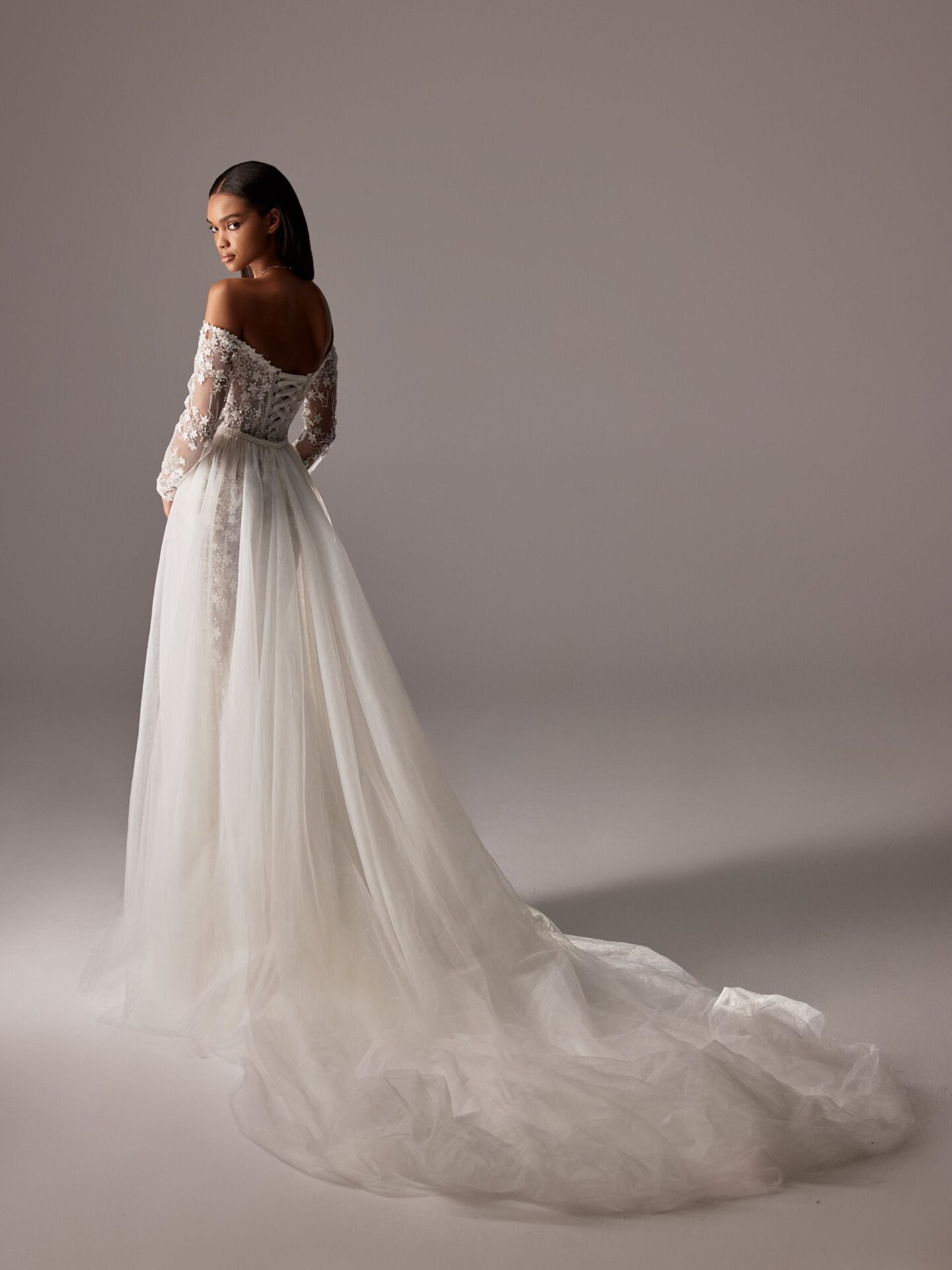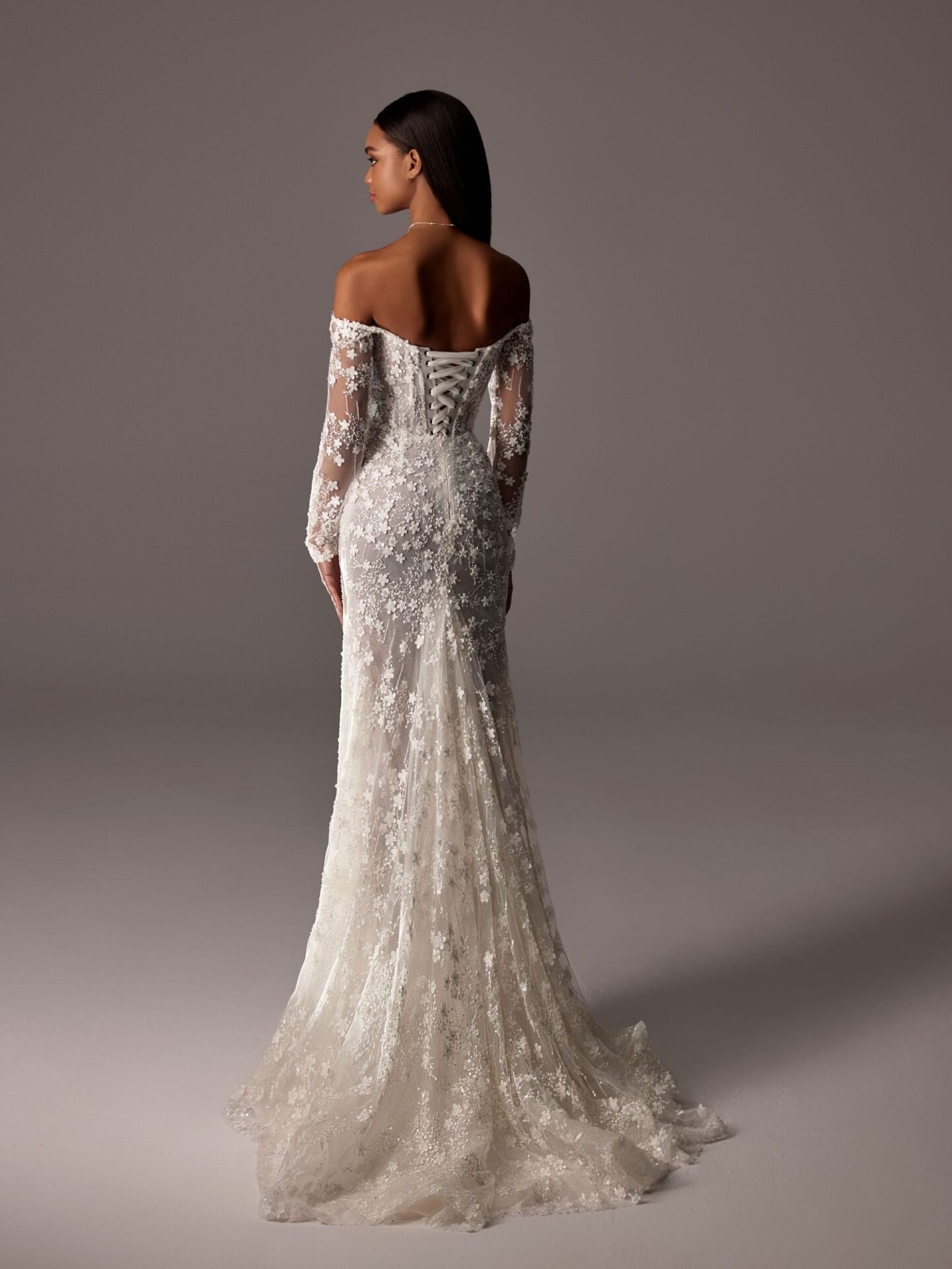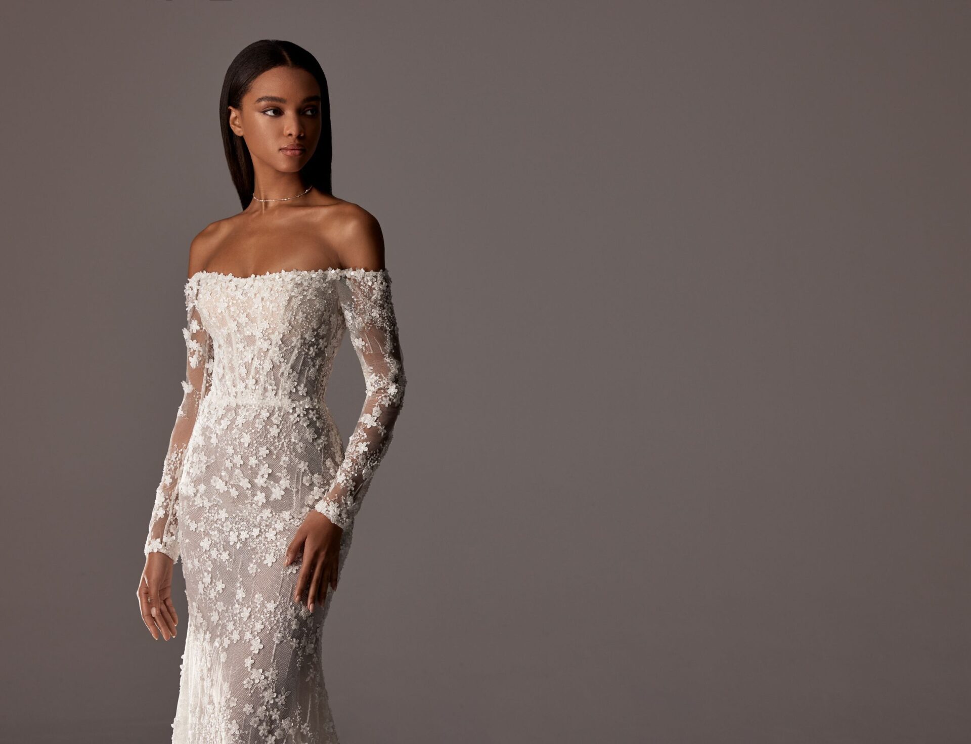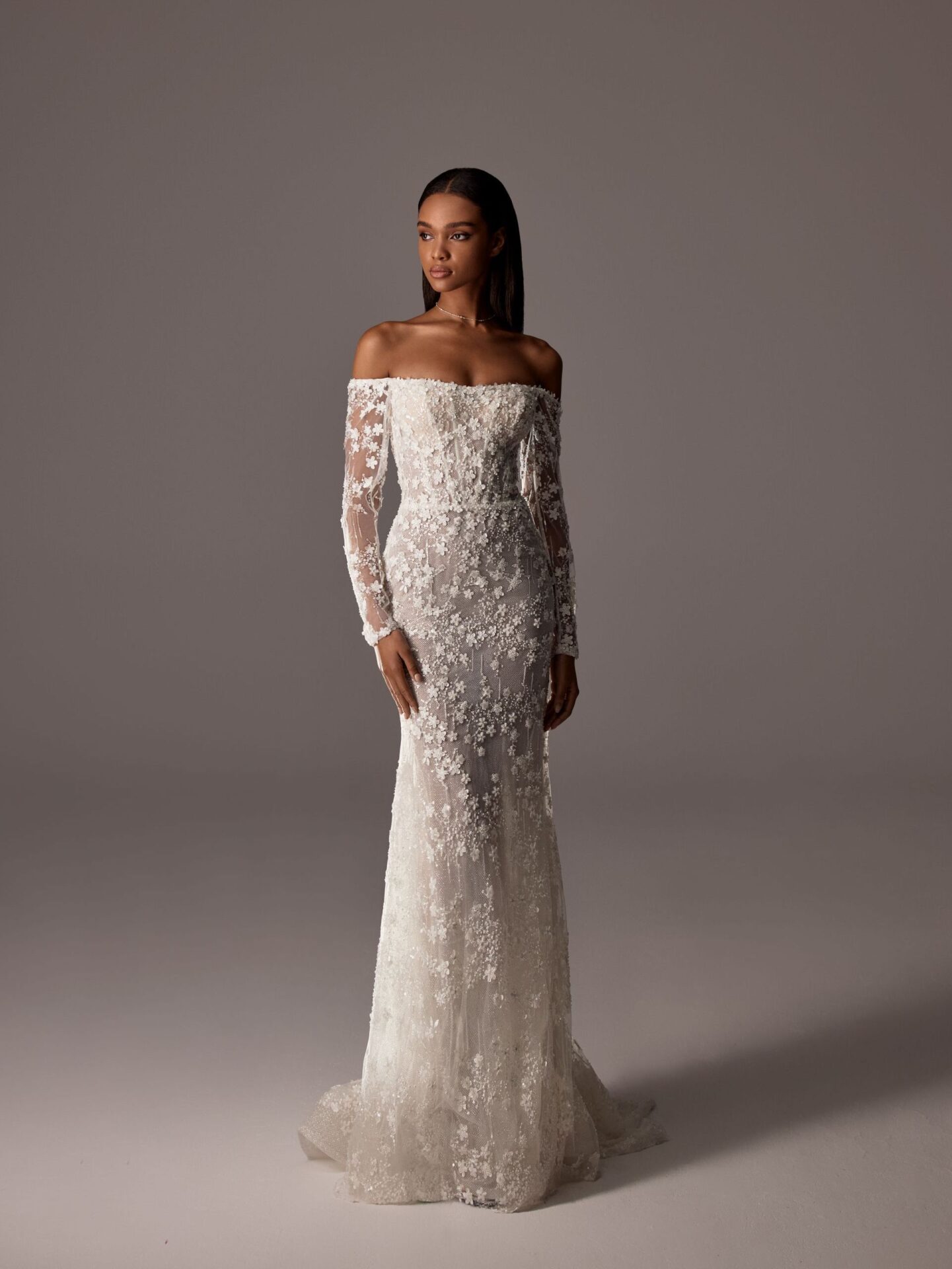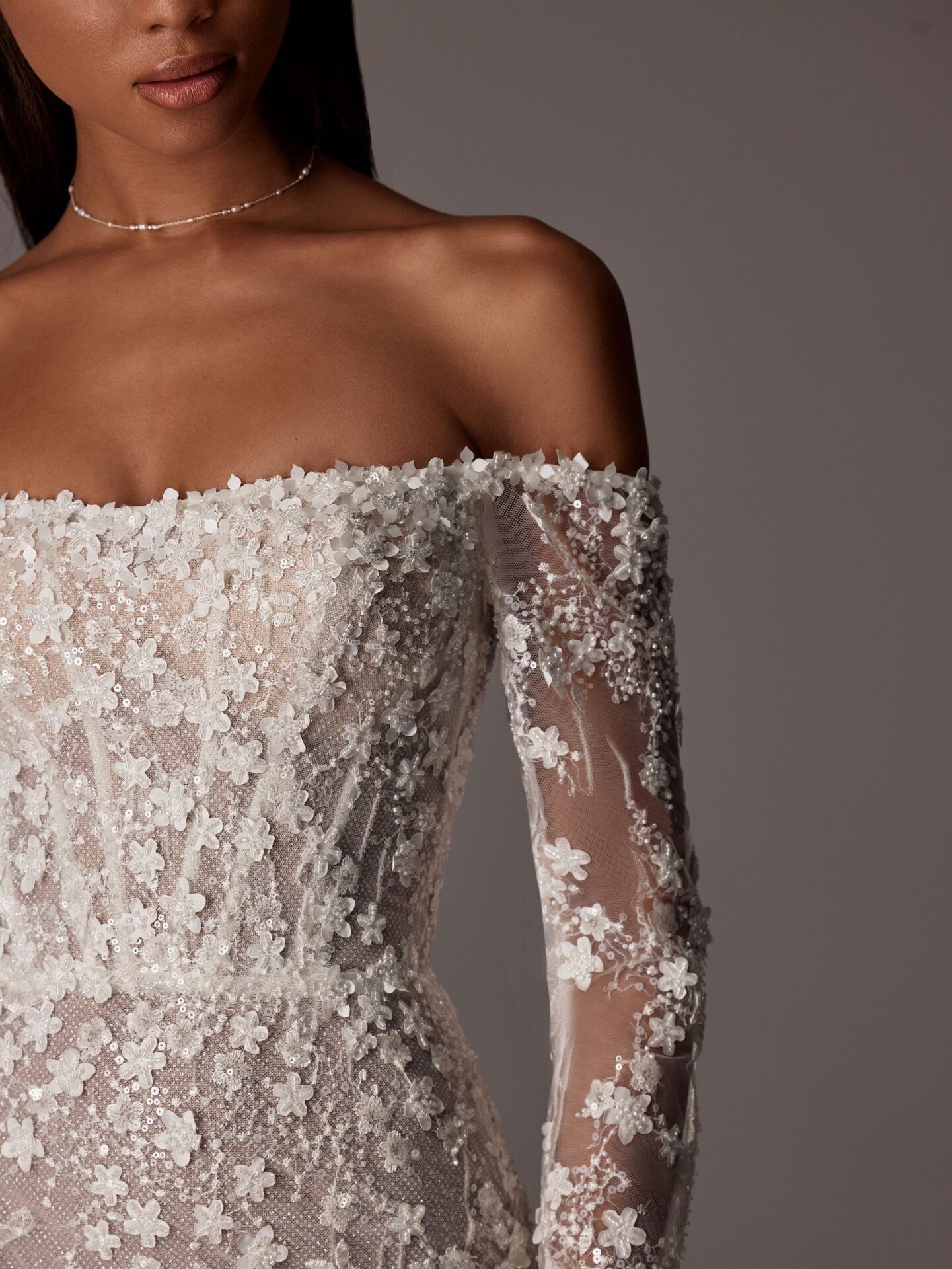 allover floral beaded fit and flow off-the-shoulder wedding dress – VIOLETT