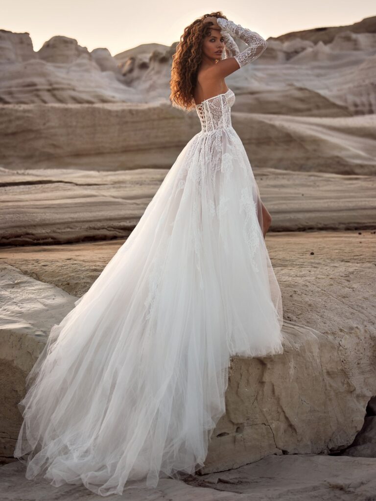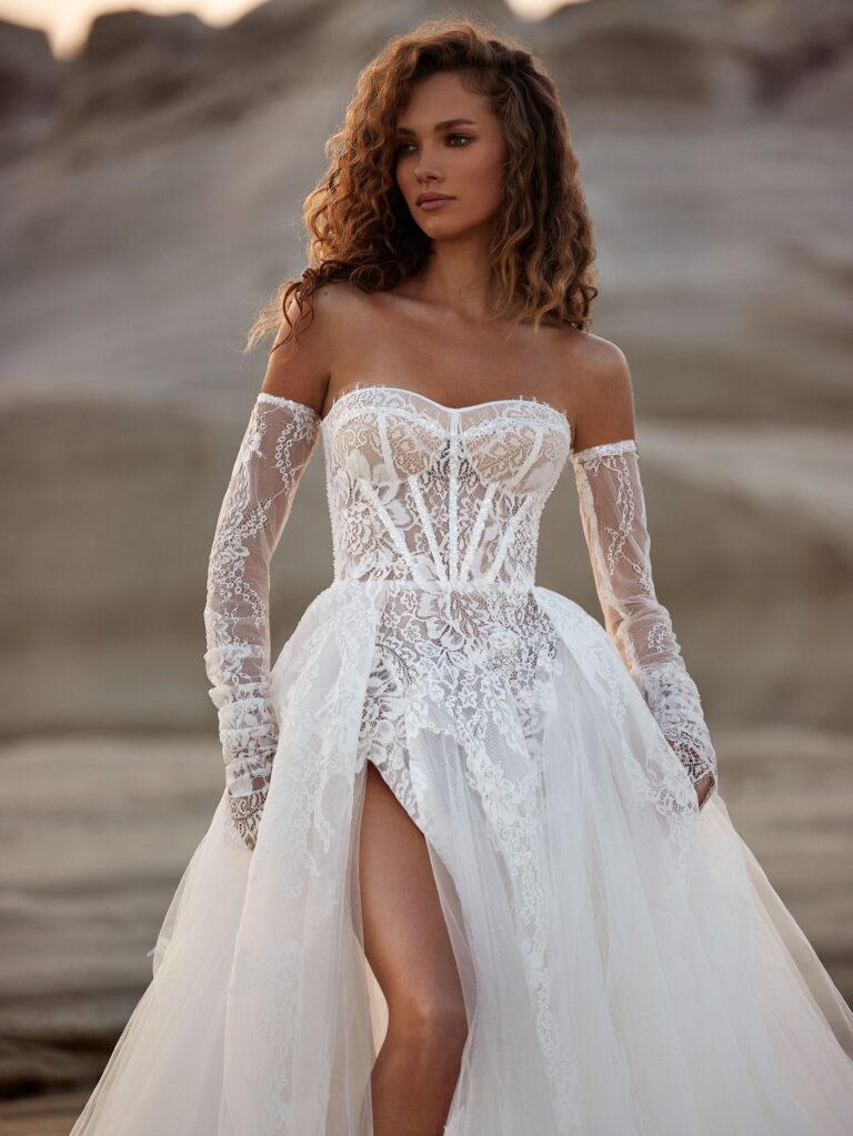 Capture elegance in our long A-line wedding dress with a corset bodice and a daring slit. The A-line silhouette gracefully drapes, while the corset enhances your figure with timeless charm. Experience the perfect blend of sophistication and allure for an unforgettable bridal statement.