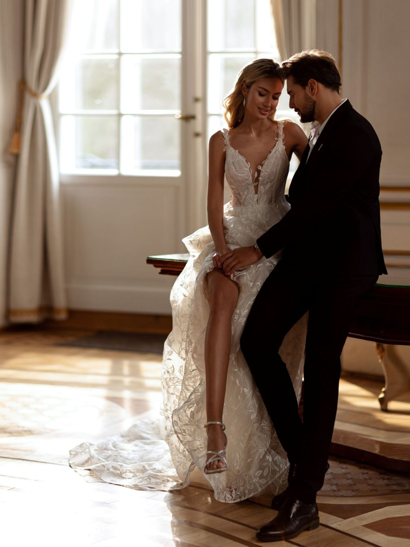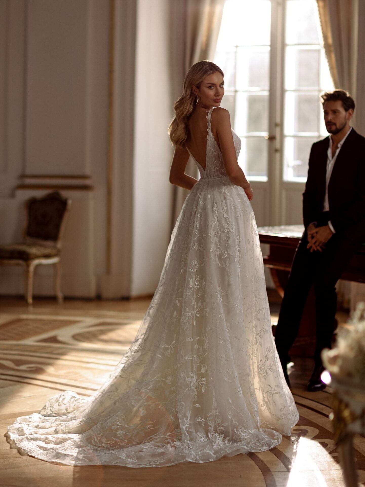 Make a dramatic entrance in our long backless deep V-neck A-line wedding dress adorned with exquisite floral details. The deep V-neckline adds a touch of allure, while the A-line silhouette creates a graceful and romantic look. Experience the perfect blend of elegance and natural beauty for an unforgettable bridal statement.
