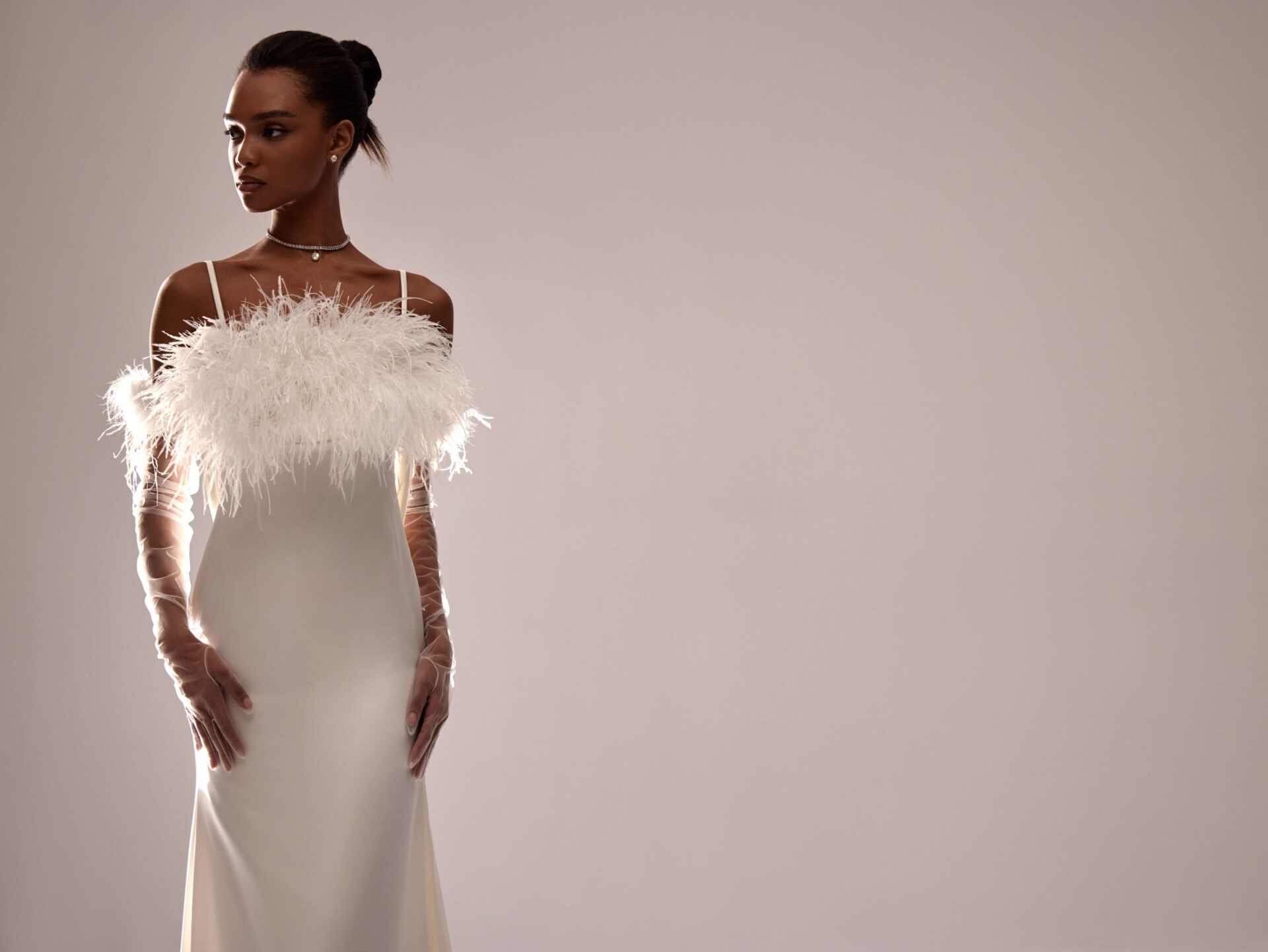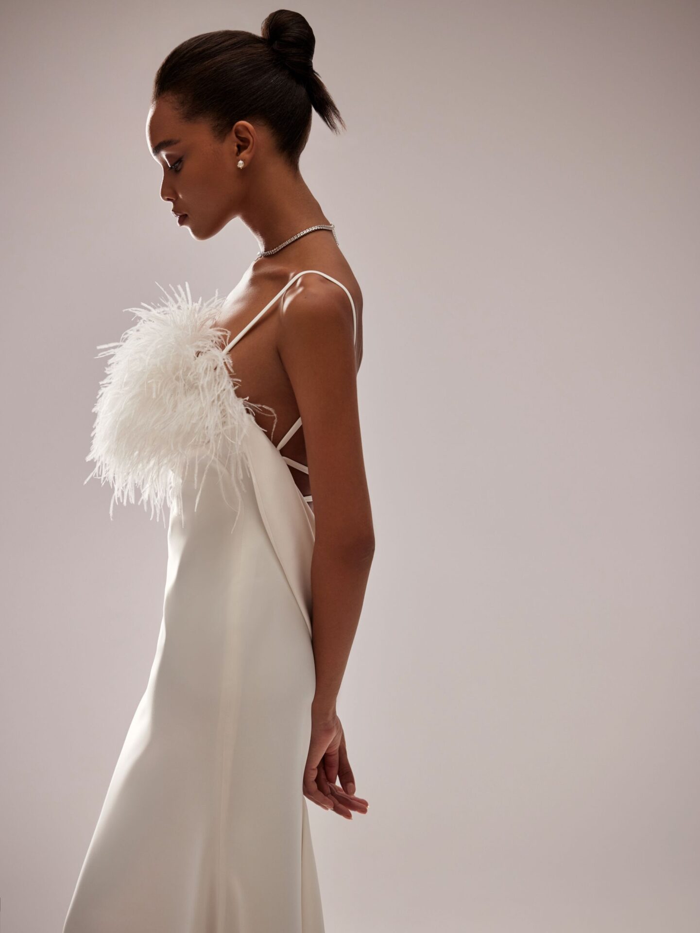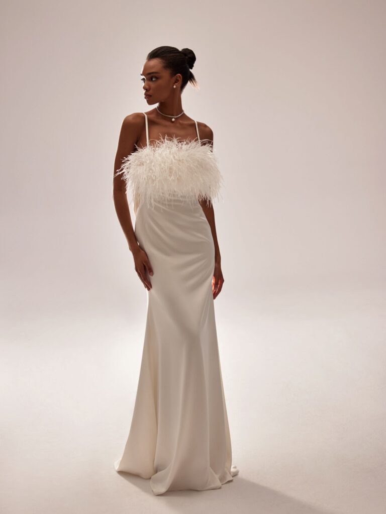 Elevate your bridal elegance with our vintage-inspired long backless silk sheath wedding gown, adorned with exquisite feather details. The luxurious silk drapes gracefully, while the feathers add a touch of whimsical charm. Experience a perfect blend of timeless beauty and modern allure, ensuring a captivating and unforgettable bridal look.